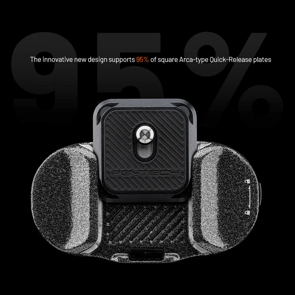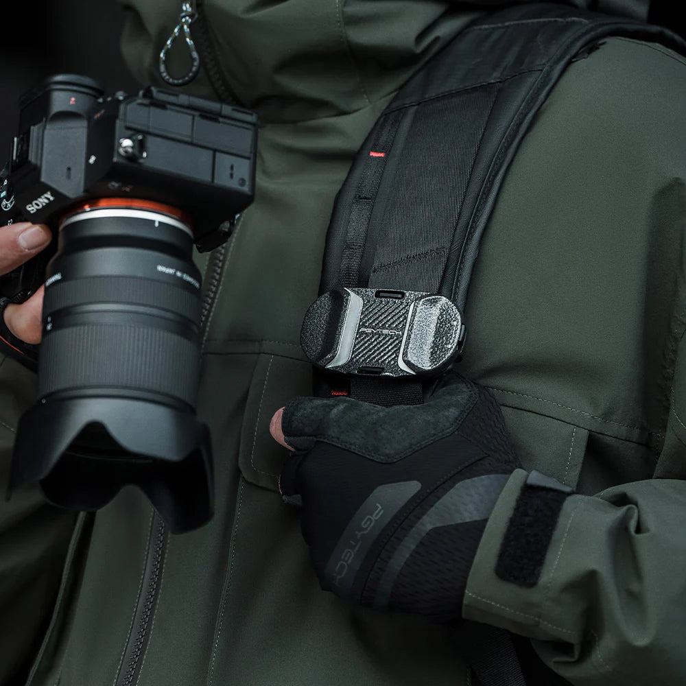 is a quick-release system for securely mounting a camera to a backpack strap, belt, or other strap, allowing for instant hands-free carrying. It features a proprietary SnapLock system for quick attachment and removal and is also compatible with 95% of square Arca-type quick-release plates.